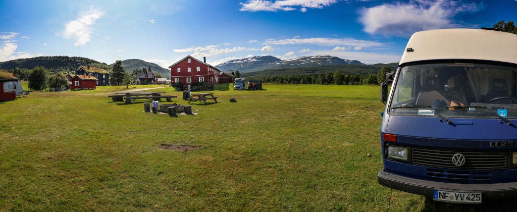 Mit dem Plan einen Campingplatz aufzusuchen, fuhren wir am folgenden Morgen weiter. In unserer Stellplatz-App fanden wir einen Platz, der vielversprechend aussah. Die Landschaft durch die wir fuhren war wieder atemberaubend. Wir fuhren durch eine bergige Landschaft mit vielen Wasserfällen und tollen Ebenen und wurden bei der Ankunft unseres auserkorenen Campingplatzes nicht enttäuscht. Auf einem Hof mit angrenzendem Wald und schneebedeckten Bergen hat die Inhaberin ein sehr idyllisches Plätzchen liebevoll hergerichtet. Die ganze Anlage war sehr heimelig und sauber und so fühlten wir uns direkt wohl. Der nächste Tag brachte wieder fantastisches Wetter, sodass es uns zu schade war, weiterzufahren. Wir wuschen Wäsche und genossen die Ruhe des abgeschiedenen Ortes. Wir haben auch irgendwie das Zeitgefühl verloren, denn zu spät bemerkten wir, dass es ja eigentlich wieder Zeit für einen Blog war, sodass dieser hier einen Tag später als gewohnt kommt. Heute scheint wieder die Sonne von einem strahlend blauen Himmel und wir überlegen noch einen weiteren Tag zu bleiben, auch wenn es sicher langsam an der Zeit ist, dem Nordkap einen Besuch abzustatten. Nächste Woche werden wir hoffentlich von dort berichten können.